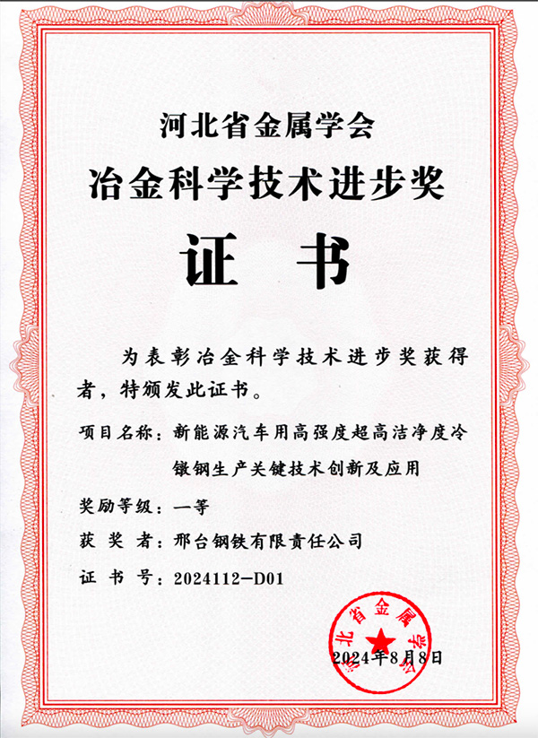 Xingtai Steel's project "Innovation and Application of Key Production Technologies for High-Strength, Ultra-High-Cleanliness Cold Heading Steel for New Energy Vehicles" was awarded the First Prize in the Hebei Metallurgical Science and Technology Progress Awards.
