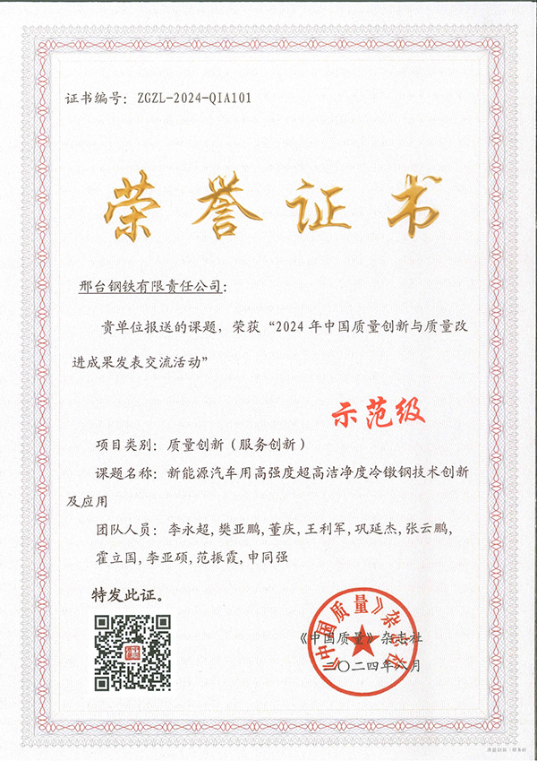 Xingtai Steel's research project "Technological Innovation and Application of High-Strength Ultra-High-Cleanliness Cold Heading Steel for New Energy Vehicles" was honored with the highest-level "Exemplary" recognition at the 2024 China Quality Innovation & Quality Improvement Achievements Exchange Event.