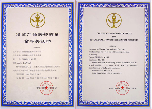 冷鐓和冷擠壓用鋼盤條ML08AL,ML35獲冶金產(chǎn)品實(shí)物質(zhì)量金杯獎