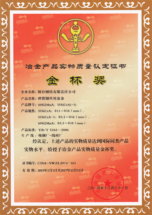 彈簧鋼絲用盤條60Si2MnA、55SiCrA(-1)獲冶金產(chǎn)品實(shí)物質(zhì)量金杯獎(jiǎng)