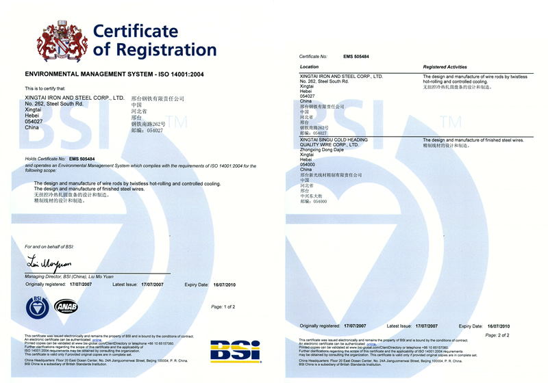 2007年7月17日,邢鋼獲ISO 14001:2004認證證書(環(huán)境管理體系要求及使用指南)。