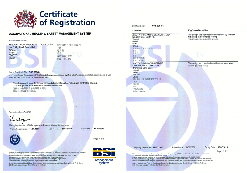 2007年7月17日,邢鋼獲OHSAS 18001:2007認證證書(職業(yè)健康安全管理體系規(guī)范)。