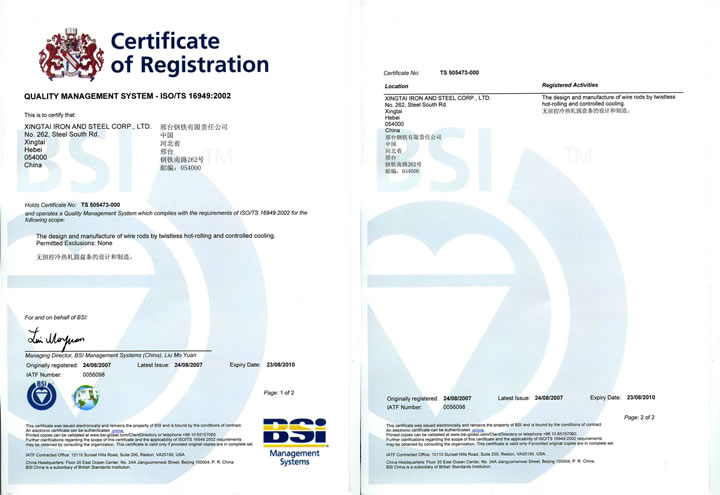2007年8月24日,邢鋼獲ISO/TS 16949:2002認證證書(國際汽車行業(yè)質(zhì)量管理體系認證)。