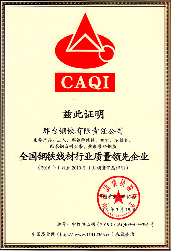 2019年3月15日,邢鋼(主要產(chǎn)品:三人、邢鋼牌純鐵、碳鋼、不銹鋼、軸承鋼系列盤條,熱軋帶肋鋼筋),被中國質(zhì)量檢驗協(xié)會授予“全國鋼鐵線材行業(yè)質(zhì)量領(lǐng)先企業(yè)”稱號。