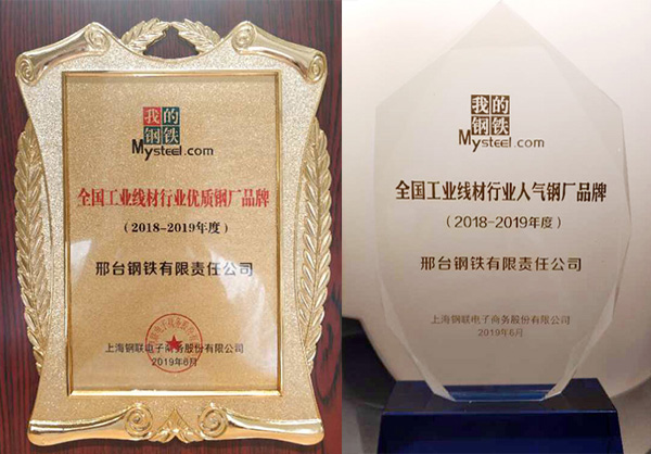 2019年6月12日,2019 Mysteel全國工業(yè)線材暨緊固件產(chǎn)業(yè)鏈高峰論壇在上海舉行。論壇會上,組委會根據(jù)國內(nèi)工業(yè)線材生產(chǎn)企業(yè)品牌、質(zhì)量表現(xiàn)、市場反饋、網(wǎng)絡(luò)投票等多個環(huán)節(jié)的評比結(jié)果,評選出2018-2019年度“全國工業(yè)線材行業(yè)優(yōu)質(zhì)鋼廠品牌”和“全國工業(yè)線材行業(yè)人氣鋼廠品牌”,并頒發(fā)了獎牌和獎杯。邢鋼榮獲此兩項榮譽稱號。
