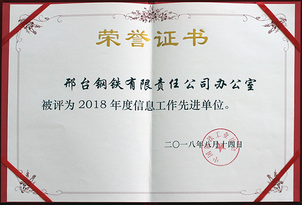 2018年8月14日,邢鋼被中國鋼鐵工業(yè)協(xié)會評為“2018年度信息工作先進單位”。