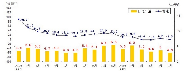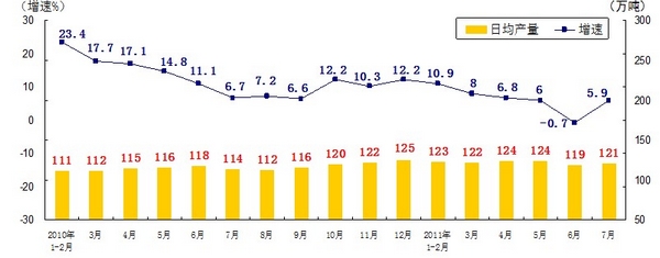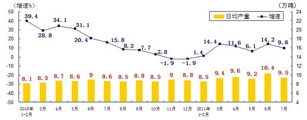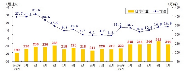 分產(chǎn)品看,7月份,468種產(chǎn)品中有381種產(chǎn)品同比增長。其中,發(fā)電量4252億千瓦時,日平均發(fā)電量137億千瓦時,增長13.2%;鋼材7572萬噸,日平均產(chǎn)量244萬噸,增長14.9%;水泥18308萬噸,日平均產(chǎn)量591萬噸,增長16.8%;原油加工量3749萬噸,日平均產(chǎn)量121萬噸,增長5.9%;十種有色金屬293萬噸,日平均產(chǎn)量9.5萬噸,增長9.8%;乙烯130萬噸,日平均產(chǎn)量4.2萬噸,增長11.5%;汽車131.8萬輛,日平均產(chǎn)量4.3萬輛,下降1.3%;轎車77.7萬輛,日平均產(chǎn)量2.5萬輛,增長12.6%。(參見附圖)