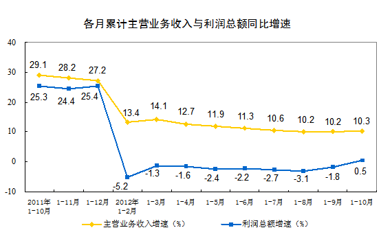 1-10月份,全國(guó)規(guī)模以上工業(yè)企業(yè)實(shí)現(xiàn)利潤(rùn)40240億元,同比增長(zhǎng)0.5%。10月當(dāng)月實(shí)現(xiàn)利潤(rùn)5001億元,同比增長(zhǎng)20.5%。