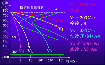 等溫轉變“TTT曲線”在連續(xù)冷卻轉變中的應用:由于連續(xù)冷卻“CCT轉變曲線”的測定較為困難,而連續(xù)冷卻轉變可以看作由許多溫度相差很小的等溫轉變過程所組成的,所以連續(xù)冷卻轉變得到的組織可認為是不同溫度下等溫轉變產(chǎn)物的混合物。故生產(chǎn)中常用TTT曲線(C曲線)近似地分析連續(xù)冷卻過程。下圖中V1(爐冷)、V2(空冷)、V3(油冷)、V4(水冷)代表熱處理中四種常用的連續(xù)冷卻方式。