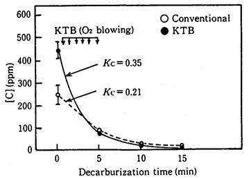 由上圖可以看出,脫碳處理初始階段采用KTB吹氧可以明顯提高脫碳速率。采用KTB和不采用KTB的表觀脫碳速率常數(shù)分別為0.35min-1、0.21min-1,而且由于采用KTB吹氧技術提高了脫碳速率,可以使脫碳處理時間縮短了3min。