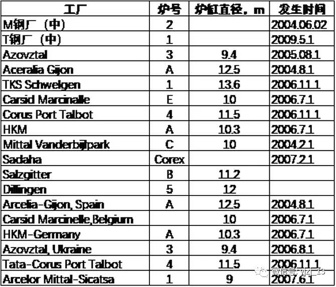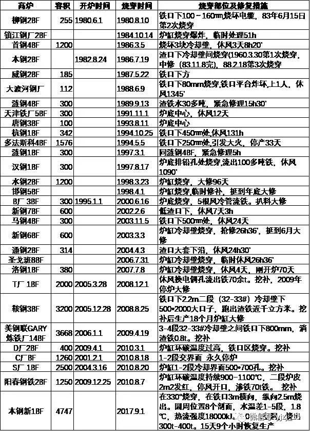 以下針對國內(nèi)外典型高爐爐缸燒出案例進行統(tǒng)計,并對燒出原因、修復和維護等方面進行詳細的說明,為國內(nèi)外高爐的長壽提供技術(shù)和數(shù)據(jù)參考。