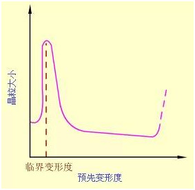 (2)預先變形度 變形度的影響主要與金屬變形的均勻度有關。變形越不均勻, 再結晶退火后的晶粒越大。變形度很小時,因不足以引起再結晶,晶粒不變。當變形度達到2~10%時,金屬中少數(shù)晶粒變形,變形分布很不均勻,所以再結晶時生成的晶核少,晶粒大小相差極大,非常有利于晶粒發(fā)生吞并過程而很快長大,結果得到極粗大的晶粒。使晶粒發(fā)生異常長大的變形度稱作臨界變形度。生產(chǎn)上應盡量避免在臨界變形度范圍內(nèi)的塑性變形加工。超過臨界變形度之后,隨變形度的增大,晶粒的變形更加強烈和均勻,再結晶核心越來越多,因此再結晶后的晶粒越來越細小。但是當變形度過大(約≥90%)時, 晶粒可能再次出現(xiàn)異常長大,一般認為它是由形變織構造成的。