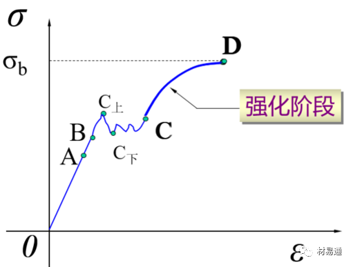 經(jīng)過屈服階段后,曲線從C點(diǎn)又開始逐漸上升,說明要使應(yīng)變增加,必須增加應(yīng)力,材料又恢復(fù)了抵抗變形的能力,這種現(xiàn)象稱作強(qiáng)化,CD段稱為強(qiáng)化階段(加工硬化)。