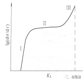 I區(qū):當(dāng)K1稍大于K1SCC時,裂紋經(jīng)過一段孕育突然加速發(fā)展,即在I區(qū)內(nèi),裂紋生長速率對K1較敏感;