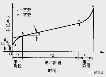 第三階段cd為加速蠕變階段隨著時(shí)間的延長(zhǎng),蠕變速率逐漸增大,到d點(diǎn)時(shí)產(chǎn)生蠕變斷裂。