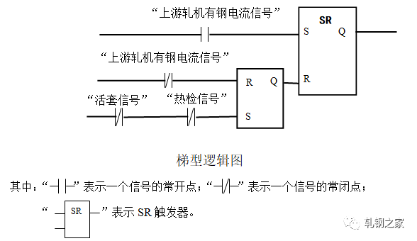 在軋件頭部進入活套后面軋機前不允許起套輥升起;在軋件頭部進入活套后面軋機后起套輥必須立即升起。當軋件尾部離開活套前面軋件時,起套輥必須立即下降。為了準確地起落套,我們首先,在活套的起落套的邏輯控制程序中設置了RS觸發(fā)器。只要下游機架“有鋼”活套就不能再次起落套。編程如下(梯型邏輯圖):其次,在起套和落套的處理上對延時時間采用了長度系數(shù)補償?shù)乃惴?,即在計算定時器的延時時間過程中將線材要走的長度(如兩機架間的距離)乘以一個百分比。這樣就可以:一、消除由于CPU軟件系統(tǒng)本身運行周期過長造成的定時計算誤差;二、靈活地適應電氣開關和機械上氣閥等的動作滯后的不一致性,以使起套輥能較準確地升起和落下。