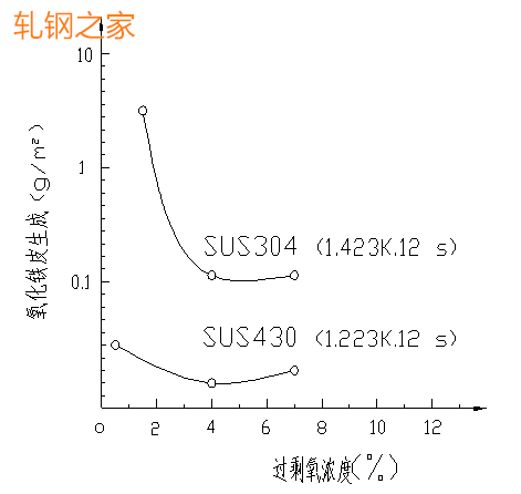 由圖2看出,不考慮退火溫度條件下,過剩氧化濃度越低,氧化鐵皮生成量越多,其原因是由于燃燒生成的水份產(chǎn)生高溫水蒸汽氧化的緣故。最好將過剩氧濃度控制在4%左右。