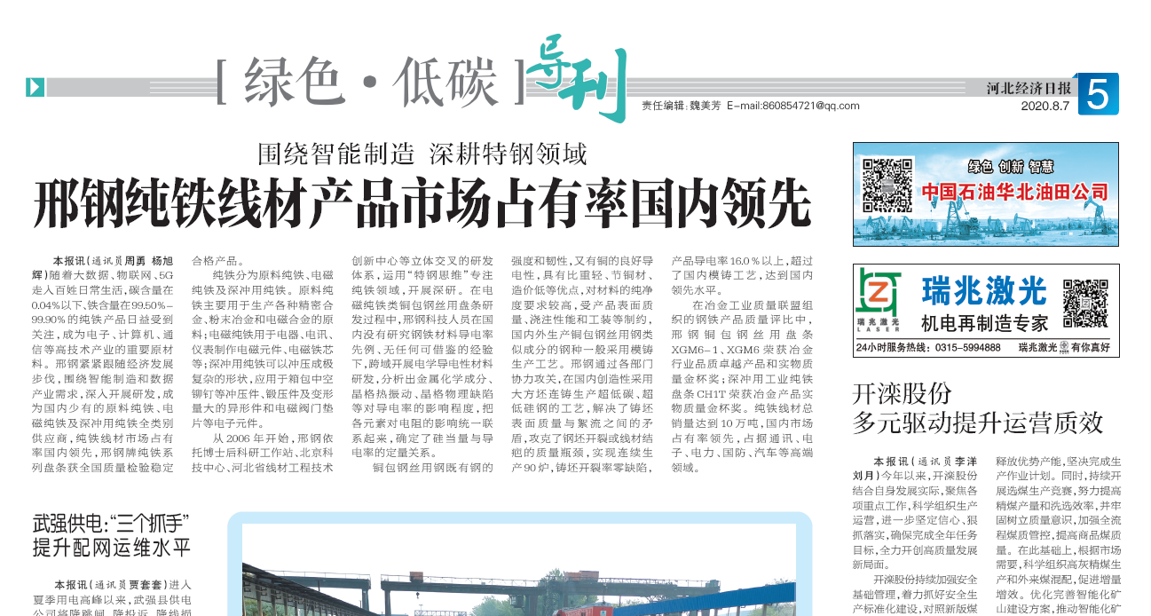 本報(bào)訊(通訊員周勇 楊旭輝)隨著大數(shù)據(jù)、物聯(lián)網(wǎng)、5G走入日常生活,碳含量在0.04%以下、鐵含量在99.50%-99.90%的純鐵產(chǎn)品日益受到關(guān)注,成為電子、計(jì)算機(jī)、通信等高技術(shù)產(chǎn)業(yè)的重要原材料。邢鋼緊緊跟隨我國(guó)經(jīng)濟(jì)發(fā)展步伐,圍繞智能制造和數(shù)據(jù)產(chǎn)業(yè)需求,深入開(kāi)展研發(fā),成為國(guó)內(nèi)少有的原料純鐵、電磁純鐵及深沖用純鐵全類(lèi)別供應(yīng)商,純鐵線材市場(chǎng)占有率國(guó)內(nèi)領(lǐng)先,邢鋼牌純鐵系列盤(pán)條獲全國(guó)質(zhì)量檢驗(yàn)穩(wěn)定合格產(chǎn)品。
