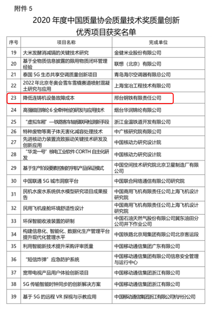 本次評(píng)選是為深入落實(shí)新時(shí)代高質(zhì)量發(fā)展要求,推動(dòng)我國(guó)質(zhì)量技術(shù)進(jìn)步,提高質(zhì)量創(chuàng)新和競(jìng)爭(zhēng)能力,根據(jù)《國(guó)家科學(xué)技術(shù)獎(jiǎng)勵(lì)條例》和《中國(guó)質(zhì)量協(xié)會(huì)質(zhì)量技術(shù)獎(jiǎng)管理辦法》有關(guān)規(guī)定,結(jié)合2020年度中國(guó)質(zhì)量協(xié)會(huì)技術(shù)獎(jiǎng)(以下簡(jiǎn)稱質(zhì)量技術(shù)獎(jiǎng))單列優(yōu)秀項(xiàng)目成果申報(bào)情況,經(jīng)質(zhì)量技術(shù)獎(jiǎng)評(píng)審委員會(huì)評(píng)審,中國(guó)質(zhì)量協(xié)會(huì)批準(zhǔn)授予的。邢鋼公司獲獎(jiǎng)項(xiàng)目—《降低連鑄機(jī)設(shè)備故障成本》為質(zhì)量創(chuàng)新類(lèi)別單列優(yōu)秀項(xiàng)目成果。