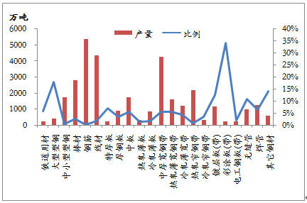 1-5月份,我國共出口鋼材1791.7萬噸,棒線材、角型材、板材、鋼管、鐵道用材和其它用材分別占11.4%、5.9%、60.1%、15.4%、1.0%和6.2%,板材所占份額最大,棒線材和鋼管次之。就前5個月出口量而言,退稅取消的鋼材品種出口數(shù)量為703.3萬噸,占1-5月份鋼材出口總量的39.3%。雖然鋼材總出口量只占到國內(nèi)產(chǎn)量的5.1%,但仍有部分品種出口占產(chǎn)量的比例較大,對出口具有一定依賴性。鍍鋅板、熱軋板卷、中厚板和大型型鋼的出口數(shù)量占產(chǎn)量的比例較大,在出口稅率下調(diào)的情況下,國內(nèi)資源供應的壓力將會明顯增大,從而影響到國內(nèi)價格的運行。不過,在政策執(zhí)行日期之前,出口企業(yè)必定要加緊落實前期簽訂的合同,熱軋卷等品種的出口可能會加大,對國內(nèi)鋼材市場將是利好。