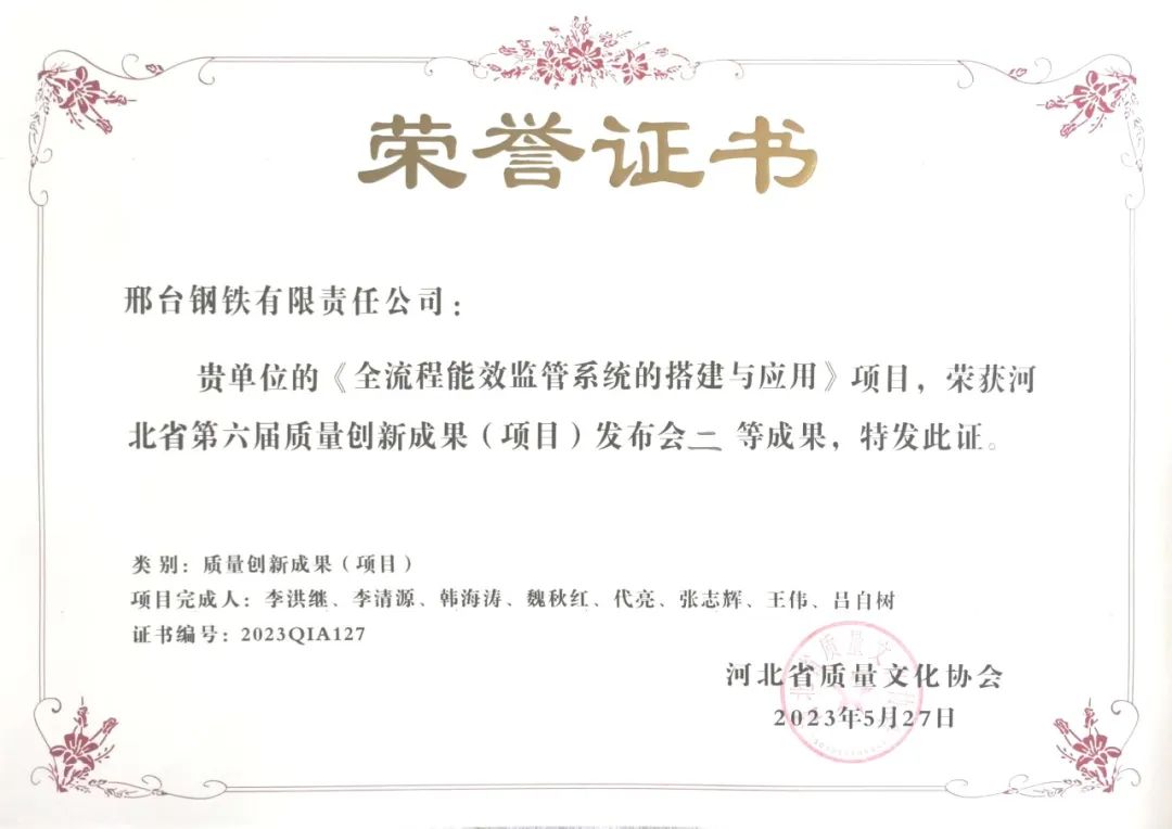 多年來,秉承“干成事”的核心價(jià)值觀,積極踐行特鋼精品戰(zhàn)略,邢鋼在轉(zhuǎn)型升級的高質(zhì)量發(fā)展過程中,走出了一條創(chuàng)新型標(biāo)桿道路。作為河北省質(zhì)量文化協(xié)會會員單位,邢鋼已連續(xù)多年應(yīng)邀參加“河北省質(zhì)量創(chuàng)新成果發(fā)布會”,截至目前,邢鋼已經(jīng)累計(jì)榮獲河北省質(zhì)量創(chuàng)新示范級成果12項(xiàng)、專業(yè)級成果11項(xiàng)、改進(jìn)級成果5項(xiàng)。