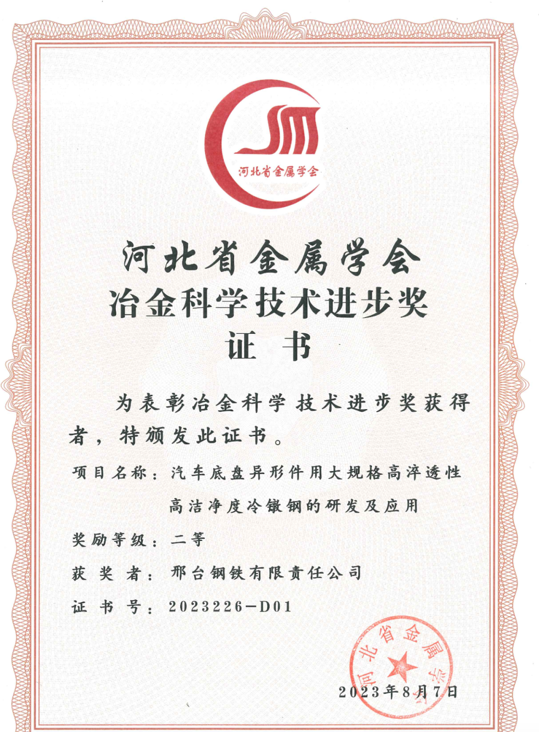 近日,邢臺鋼鐵有限責(zé)任公司兩項科技研發(fā)項目“高性能緊固件用鋼的研發(fā)及產(chǎn)業(yè)化應(yīng)用項目”“汽車底盤異形件用大規(guī)格高淬透性高潔凈度冷鐓鋼的研發(fā)及應(yīng)用”得到河北省金屬學(xué)會專家評審委員會的高度認(rèn)可,分別榮獲2023年度的 “河北冶金科學(xué)技術(shù)獎”一、二等獎。