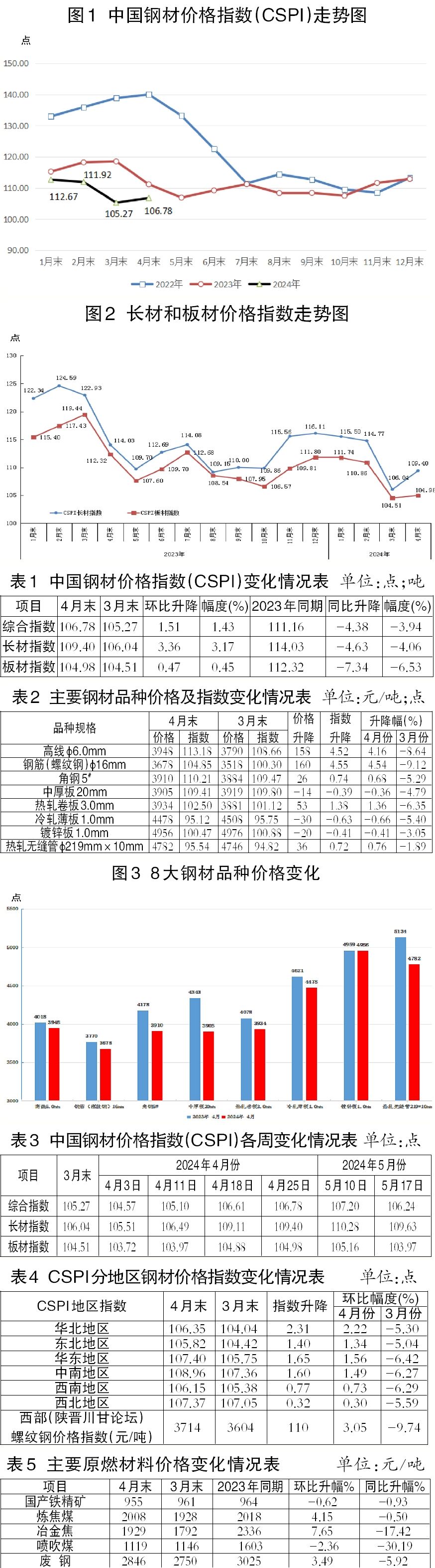 截至4月末,CSPI長材指數(shù)為109.40點,環(huán)比上升3.36點,升幅為3.17%;CSPI板材指數(shù)為104.98點,環(huán)比上升0.47點,升幅為0.45%;與上年同期相比,CSPI長材、板材指數(shù)分別下降4.63點和7.34點,降幅分別為4.06%和6.53%。