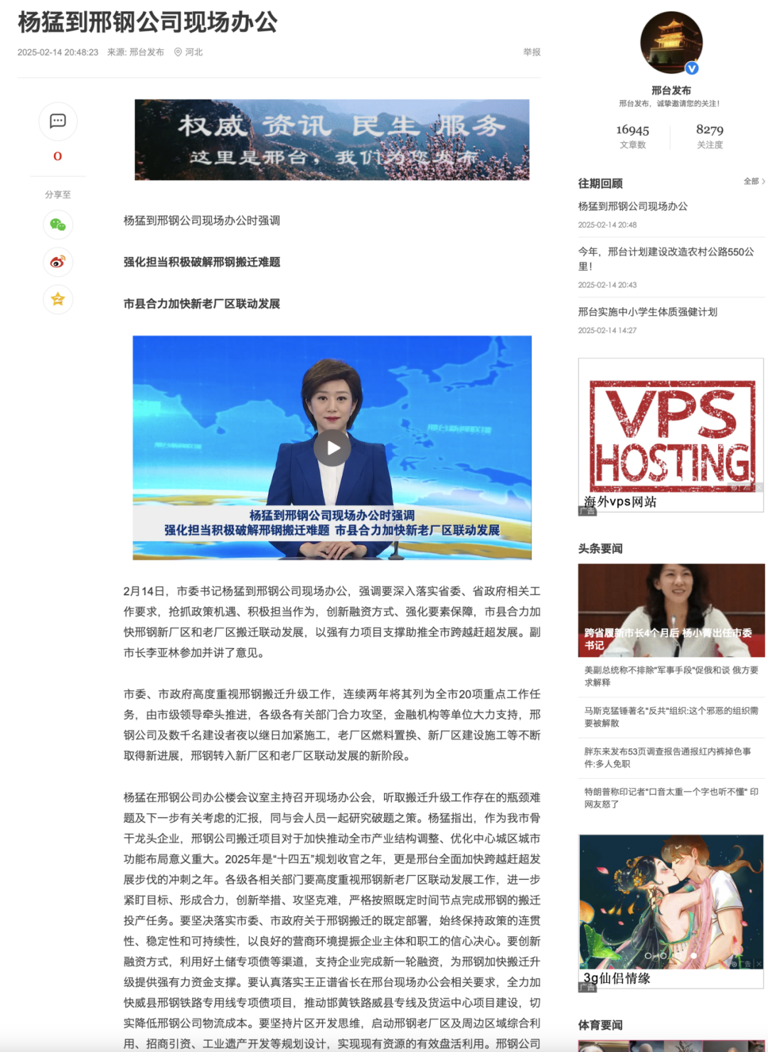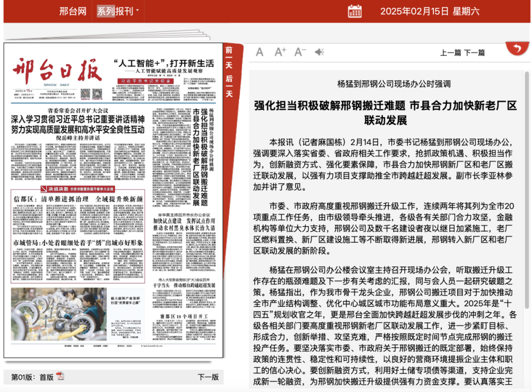 2月14日,市委書記楊猛到邢鋼公司現(xiàn)場辦公,強調要深入落實省委、省政府相關工作要求,搶抓政策機遇、積極擔當作為,創(chuàng)新融資方式、強化要素保障,市縣合力加快邢鋼新廠區(qū)和老廠區(qū)搬遷聯(lián)動發(fā)展,以強有力項目支撐助推全市跨越趕超發(fā)展。副市長李亞林參加并講了意見。