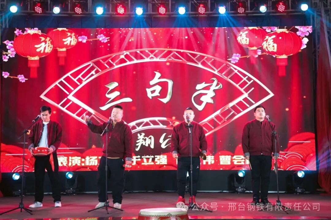 煉鋼廠、線材廠、煉鐵廠、新翔公司等二級單位、子公司錄制了《邢鋼職工賀新春》視頻,祝福邢鋼,喜迎新春,為聯(lián)歡會烘托出濃厚的節(jié)日氣氛。煉鋼廠張康建等一曲《你盡管盛開》讓觀眾感受到了春天的腳步,新翔公司曹會拴等表演的三句半《新翔戰(zhàn)鼓,奮進新程》展現(xiàn)了邢鋼人樂觀、自信、拼搏的精神風(fēng)貌;能源動力部王建軍的《就戀這把土》,碳資產(chǎn)管理部蘆麗華的《世界贈予我的》,線材廠魏東等的《往事如煙》、《正義之道》,退休職工申學(xué)軍的《戲曲串燒》,或熾熱張揚,或深情款款,或戲韻醇厚,展現(xiàn)了邢鋼職工的別樣精彩;銷售公司張可等的舞蹈《上春山》,旋律歡快,舞步輕盈,讓整個舞臺春意盎然;煉鐵廠劉世沛、毛恒等的小品《考察》,現(xiàn)場“笑”果滿滿,在輕松、詼諧的表演中,展示了廣大員工對新邢鋼美好未來的信心。邢鋼搬遷項目指揮部邢闊君、王綿等的詩朗誦《鋼鐵鑄新程,奮進向未來》,以新邢鋼建設(shè)者的身份,青春激揚,誓言錚錚,抒發(fā)在新邢鋼追求夢想、實現(xiàn)人生價值的滿腔赤誠。聯(lián)歡會穿插了現(xiàn)場幸運觀眾抽獎的環(huán)節(jié),收到新春禮品的觀眾喜笑顏開。