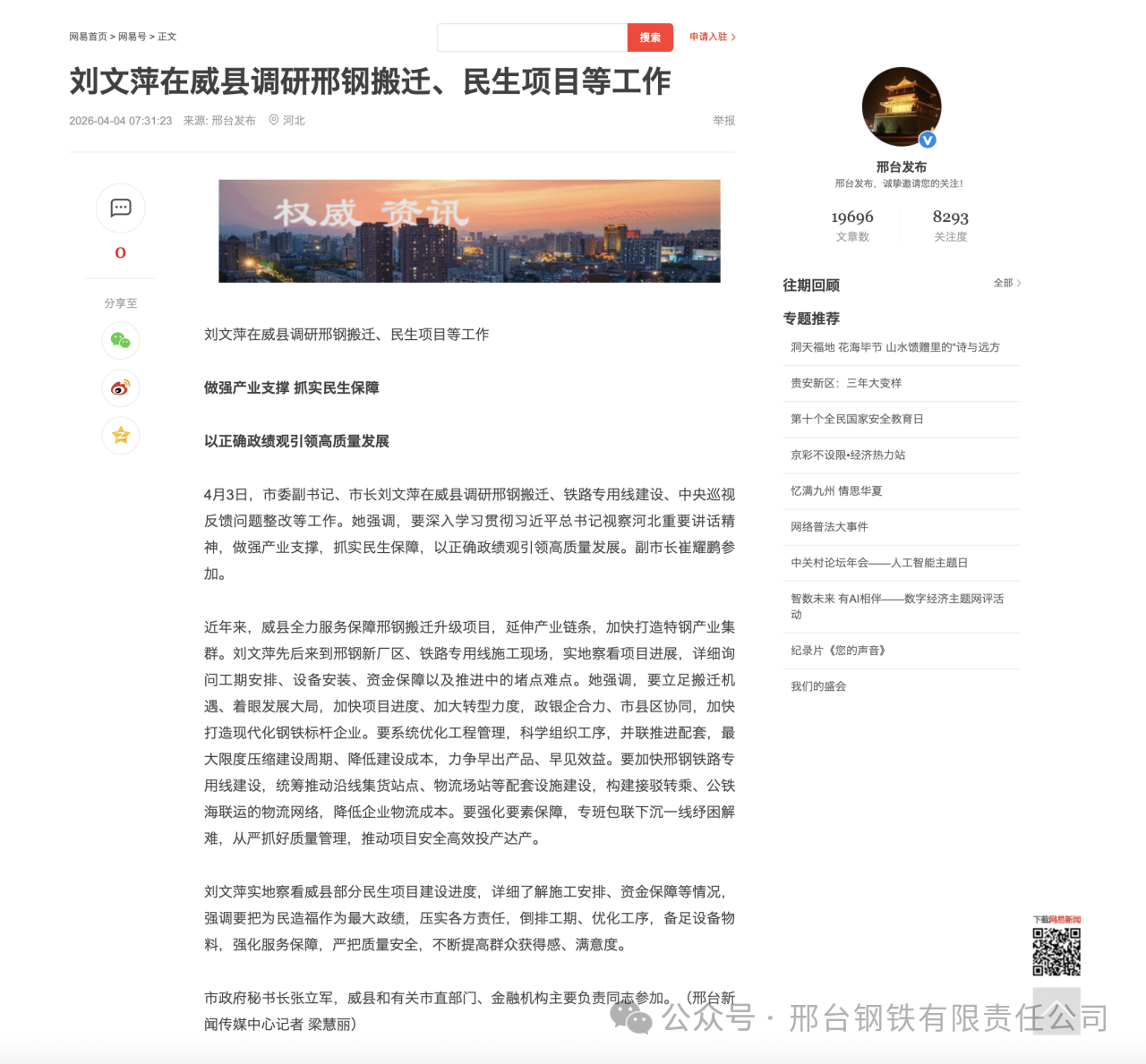 4月3日,市委副書記、市長劉文萍在威縣調(diào)研邢鋼搬遷、鐵路專用線建設(shè)、中央巡視反饋問題整改等工作。她強調(diào),要深入學(xué)習貫徹習近平總書記視察河北重要講話精神,做強產(chǎn)業(yè)支撐,抓實民生保障,以正確政績觀引領(lǐng)高質(zhì)量發(fā)展。副市長崔耀鵬參加。